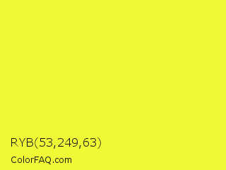 RYB 53,249,63 Color is a normal yellow color and the nearest color is Golden Fizz #f5fb3d. Hex code #eff935 and RGB value is rgb(239,249,53). In RGB color space, this color is composed of 94% red, 98% green, 21% blue, In CMYK color space, this color is composed of 4% cyan, 0% magenta, 79% yellow , 2% black , In HSL color space, this color has a hue angle of 63° , 94% saturation and 59% lightness.