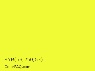 RYB 53,250,63 Color is a normal yellow color and the nearest color is Golden Fizz #f5fb3d. Hex code #f0fa35 and RGB value is rgb(240,250,53). In RGB color space, this color is composed of 94% red, 98% green, 21% blue, In CMYK color space, this color is composed of 4% cyan, 0% magenta, 79% yellow , 2% black , In HSL color space, this color has a hue angle of 63° , 95% saturation and 59% lightness.