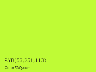 RYB 53,251,113 Color is a normal lime color and the nearest color is Green Yellow #adff2f. Hex code #bffb35 and RGB value is rgb(191,251,53). In RGB color space, this color is composed of 75% red, 98% green, 21% blue, In CMYK color space, this color is composed of 24% cyan, 0% magenta, 79% yellow , 2% black , In HSL color space, this color has a hue angle of 78° , 96% saturation and 60% lightness.