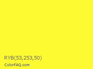 RYB 53,253,50 Color is a normal yellow color and the nearest color is Yellow RYB #fefe33. Hex code #fdfa32 and RGB value is rgb(253,250,50). In RGB color space, this color is composed of 99% red, 98% green, 20% blue, In CMYK color space, this color is composed of 0% cyan, 1% magenta, 80% yellow , 1% black , In HSL color space, this color has a hue angle of 59° , 98% saturation and 59% lightness.