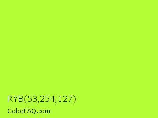 RYB 53,254,127 Color is a normal green color and the nearest color is Green Yellow #adff2f. Hex code #b4fe35 and RGB value is rgb(180,254,53). In RGB color space, this color is composed of 71% red, 100% green, 21% blue, In CMYK color space, this color is composed of 29% cyan, 0% magenta, 79% yellow , 0% black , In HSL color space, this color has a hue angle of 82° , 99% saturation and 60% lightness.
