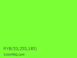 RYB 53,255,185 Color is a normal green color and the nearest color is Spring Frost #87ff2a. Hex code #7bff35 and RGB value is rgb(123,255,53). In RGB color space, this color is composed of 48% red, 100% green, 21% blue, In CMYK color space, this color is composed of 52% cyan, 0% magenta, 79% yellow , 0% black , In HSL color space, this color has a hue angle of 99° , 100% saturation and 60% lightness.
