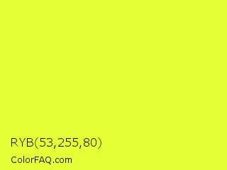 RYB 53,255,80 Color is a normal yellow color and the nearest color is Golden Fizz #f5fb3d. Hex code #e4ff35 and RGB value is rgb(228,255,53). In RGB color space, this color is composed of 89% red, 100% green, 21% blue, In CMYK color space, this color is composed of 11% cyan, 0% magenta, 79% yellow , 0% black , In HSL color space, this color has a hue angle of 68° , 100% saturation and 60% lightness.
