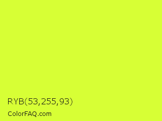 RYB 53,255,93 Color is a normal lime color and the nearest color is Starship #ecf245. Hex code #d7ff35 and RGB value is rgb(215,255,53). In RGB color space, this color is composed of 84% red, 100% green, 21% blue, In CMYK color space, this color is composed of 16% cyan, 0% magenta, 79% yellow , 0% black , In HSL color space, this color has a hue angle of 72° , 100% saturation and 60% lightness.