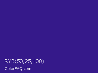 RYB 53,25,138 Color is a normal indigo color and the nearest color is Pixie Powder #391285. Hex code #35198a and RGB value is rgb(53,25,138). In RGB color space, this color is composed of 21% red, 10% green, 54% blue, In CMYK color space, this color is composed of 62% cyan, 82% magenta, 0% yellow , 46% black , In HSL color space, this color has a hue angle of 255° , 69% saturation and 32% lightness.
