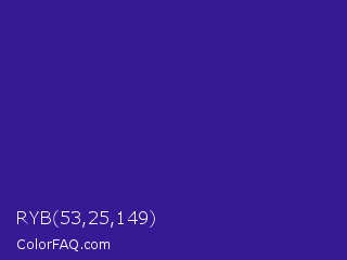 RYB 53,25,149 Color is a normal indigo color and the nearest color is Blue Gem #2c0e8c. Hex code #351995 and RGB value is rgb(53,25,149). In RGB color space, this color is composed of 21% red, 10% green, 58% blue, In CMYK color space, this color is composed of 64% cyan, 83% magenta, 0% yellow , 42% black , In HSL color space, this color has a hue angle of 254° , 71% saturation and 34% lightness.