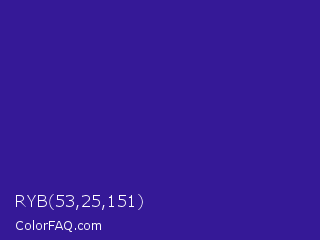 RYB 53,25,151 Color is a normal indigo color and the nearest color is Blue Gem #2c0e8c. Hex code #351997 and RGB value is rgb(53,25,151). In RGB color space, this color is composed of 21% red, 10% green, 59% blue, In CMYK color space, this color is composed of 65% cyan, 83% magenta, 0% yellow , 41% black , In HSL color space, this color has a hue angle of 253° , 72% saturation and 35% lightness.