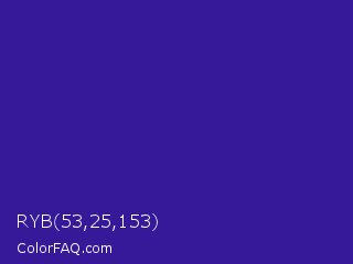 RYB 53,25,153 Color is a normal indigo color and the nearest color is Blue Gem #2c0e8c. Hex code #351999 and RGB value is rgb(53,25,153). In RGB color space, this color is composed of 21% red, 10% green, 60% blue, In CMYK color space, this color is composed of 65% cyan, 84% magenta, 0% yellow , 40% black , In HSL color space, this color has a hue angle of 253° , 72% saturation and 35% lightness.