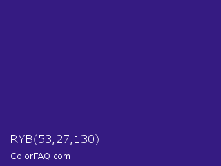 RYB 53,27,130 Color is a normal indigo color and the nearest color is Pixie Powder #391285. Hex code #351b82 and RGB value is rgb(53,27,130). In RGB color space, this color is composed of 21% red, 11% green, 51% blue, In CMYK color space, this color is composed of 59% cyan, 79% magenta, 0% yellow , 49% black , In HSL color space, this color has a hue angle of 255° , 66% saturation and 31% lightness.