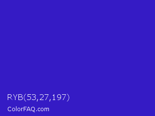 RYB 53,27,197 Color is a normal indigo color and the nearest color is Interdimensional Blue #360ccc. Hex code #351bc5 and RGB value is rgb(53,27,197). In RGB color space, this color is composed of 21% red, 11% green, 77% blue, In CMYK color space, this color is composed of 73% cyan, 86% magenta, 0% yellow , 23% black , In HSL color space, this color has a hue angle of 249° , 76% saturation and 44% lightness.
