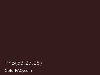 RYB 53,27,28 Color is a very dark red color and the nearest color is Eclipse #311c17. Hex code #351b1c and RGB value is rgb(53,27,28). In RGB color space, this color is composed of 21% red, 11% green, 11% blue, In CMYK color space, this color is composed of 0% cyan, 49% magenta, 47% yellow , 79% black , In HSL color space, this color has a hue angle of 358° , 33% saturation and 16% lightness.