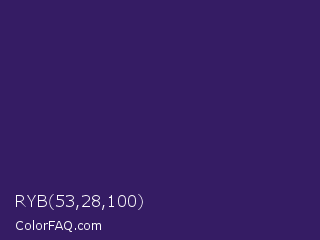 RYB 53,28,100 Color is a dark violet color and the nearest color is Jacarta #3a2a6a. Hex code #351c64 and RGB value is rgb(53,28,100). In RGB color space, this color is composed of 21% red, 11% green, 39% blue, In CMYK color space, this color is composed of 47% cyan, 72% magenta, 0% yellow , 61% black , In HSL color space, this color has a hue angle of 261° , 56% saturation and 25% lightness.