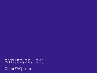 RYB 53,28,134 Color is a normal indigo color and the nearest color is Pixie Powder #391285. Hex code #351c86 and RGB value is rgb(53,28,134). In RGB color space, this color is composed of 21% red, 11% green, 53% blue, In CMYK color space, this color is composed of 60% cyan, 79% magenta, 0% yellow , 47% black , In HSL color space, this color has a hue angle of 254° , 65% saturation and 32% lightness.