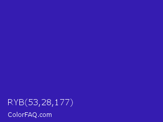 RYB 53,28,177 Color is a normal indigo color and the nearest color is Interdimensional Blue #360ccc. Hex code #351cb1 and RGB value is rgb(53,28,177). In RGB color space, this color is composed of 21% red, 11% green, 69% blue, In CMYK color space, this color is composed of 70% cyan, 84% magenta, 0% yellow , 31% black , In HSL color space, this color has a hue angle of 250° , 73% saturation and 40% lightness.