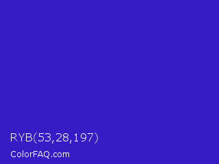 RYB 53,28,197 Color is a normal indigo color and the nearest color is Interdimensional Blue #360ccc. Hex code #351cc5 and RGB value is rgb(53,28,197). In RGB color space, this color is composed of 21% red, 11% green, 77% blue, In CMYK color space, this color is composed of 73% cyan, 86% magenta, 0% yellow , 23% black , In HSL color space, this color has a hue angle of 249° , 75% saturation and 44% lightness.
