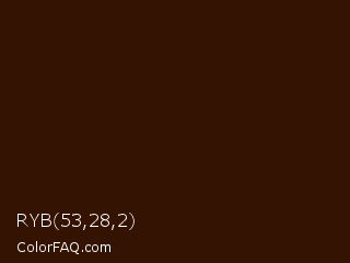 RYB 53,28,2 Color is a very dark orange color and the nearest color is Rebel #3c1206. Hex code #351302 and RGB value is rgb(53,19,2). In RGB color space, this color is composed of 21% red, 7% green, 1% blue, In CMYK color space, this color is composed of 0% cyan, 64% magenta, 96% yellow , 79% black , In HSL color space, this color has a hue angle of 20° , 93% saturation and 11% lightness.