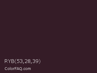 RYB 53,28,39 Color is a very dark rose color and the nearest color is Jon #3b1f1f. Hex code #351c27 and RGB value is rgb(53,28,39). In RGB color space, this color is composed of 21% red, 11% green, 15% blue, In CMYK color space, this color is composed of 0% cyan, 47% magenta, 26% yellow , 79% black , In HSL color space, this color has a hue angle of 334° , 31% saturation and 16% lightness.