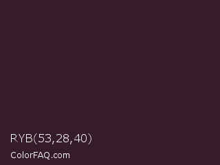 RYB 53,28,40 Color is a very dark rose color and the nearest color is Jon #3b1f1f. Hex code #351c28 and RGB value is rgb(53,28,40). In RGB color space, this color is composed of 21% red, 11% green, 16% blue, In CMYK color space, this color is composed of 0% cyan, 47% magenta, 25% yellow , 79% black , In HSL color space, this color has a hue angle of 331° , 31% saturation and 16% lightness.