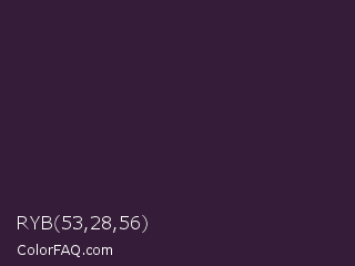 RYB 53,28,56 Color is a very dark magenta color and the nearest color is Dark Purple #301934. Hex code #351c38 and RGB value is rgb(53,28,56). In RGB color space, this color is composed of 21% red, 11% green, 22% blue, In CMYK color space, this color is composed of 5% cyan, 50% magenta, 0% yellow , 78% black , In HSL color space, this color has a hue angle of 294° , 33% saturation and 16% lightness.