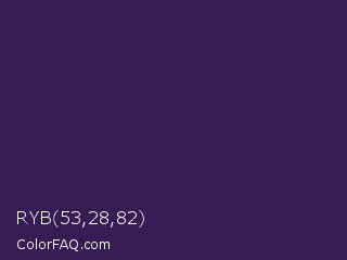 RYB 53,28,82 Color is a very dark violet color and the nearest color is Deep Grape #381a51. Hex code #351c52 and RGB value is rgb(53,28,82). In RGB color space, this color is composed of 21% red, 11% green, 32% blue, In CMYK color space, this color is composed of 35% cyan, 66% magenta, 0% yellow , 68% black , In HSL color space, this color has a hue angle of 268° , 49% saturation and 22% lightness.