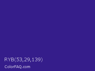 RYB 53,29,139 Color is a normal indigo color and the nearest color is Pixie Powder #391285. Hex code #351d8b and RGB value is rgb(53,29,139). In RGB color space, this color is composed of 21% red, 11% green, 55% blue, In CMYK color space, this color is composed of 62% cyan, 79% magenta, 0% yellow , 45% black , In HSL color space, this color has a hue angle of 253° , 65% saturation and 33% lightness.