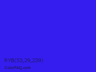 RYB 53,29,239 Color is a normal indigo color and the nearest color is Bluebonnet #1c1cf0. Hex code #351def and RGB value is rgb(53,29,239). In RGB color space, this color is composed of 21% red, 11% green, 94% blue, In CMYK color space, this color is composed of 78% cyan, 88% magenta, 0% yellow , 6% black , In HSL color space, this color has a hue angle of 247° , 87% saturation and 53% lightness.