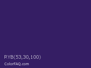 RYB 53,30,100 Color is a dark indigo color and the nearest color is Jacarta #3a2a6a. Hex code #351e64 and RGB value is rgb(53,30,100). In RGB color space, this color is composed of 21% red, 12% green, 39% blue, In CMYK color space, this color is composed of 47% cyan, 70% magenta, 0% yellow , 61% black , In HSL color space, this color has a hue angle of 260° , 54% saturation and 25% lightness.