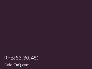 RYB 53,30,48 Color is a very dark magenta color and the nearest color is Dark Purple #301934. Hex code #351e30 and RGB value is rgb(53,30,48). In RGB color space, this color is composed of 21% red, 12% green, 19% blue, In CMYK color space, this color is composed of 0% cyan, 43% magenta, 9% yellow , 79% black , In HSL color space, this color has a hue angle of 313° , 28% saturation and 16% lightness.
