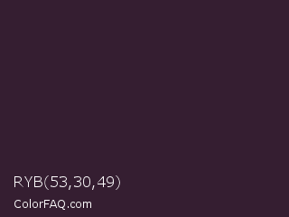 RYB 53,30,49 Color is a very dark magenta color and the nearest color is Dark Purple #301934. Hex code #351e31 and RGB value is rgb(53,30,49). In RGB color space, this color is composed of 21% red, 12% green, 19% blue, In CMYK color space, this color is composed of 0% cyan, 43% magenta, 8% yellow , 79% black , In HSL color space, this color has a hue angle of 310° , 28% saturation and 16% lightness.