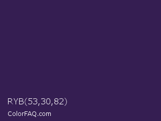 RYB 53,30,82 Color is a very dark violet color and the nearest color is Deep Grape #381a51. Hex code #351e52 and RGB value is rgb(53,30,82). In RGB color space, this color is composed of 21% red, 12% green, 32% blue, In CMYK color space, this color is composed of 35% cyan, 63% magenta, 0% yellow , 68% black , In HSL color space, this color has a hue angle of 267° , 46% saturation and 22% lightness.