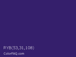 RYB 53,31,108 Color is a dark indigo color and the nearest color is Meteorite #3c1f76. Hex code #351f6c and RGB value is rgb(53,31,108). In RGB color space, this color is composed of 21% red, 12% green, 42% blue, In CMYK color space, this color is composed of 51% cyan, 71% magenta, 0% yellow , 58% black , In HSL color space, this color has a hue angle of 257° , 55% saturation and 27% lightness.