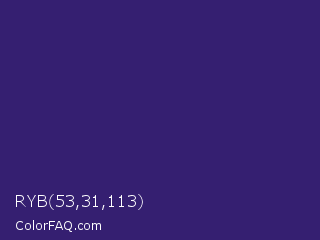RYB 53,31,113 Color is a dark indigo color and the nearest color is Meteorite #3c1f76. Hex code #351f71 and RGB value is rgb(53,31,113). In RGB color space, this color is composed of 21% red, 12% green, 44% blue, In CMYK color space, this color is composed of 53% cyan, 73% magenta, 0% yellow , 56% black , In HSL color space, this color has a hue angle of 256° , 57% saturation and 28% lightness.