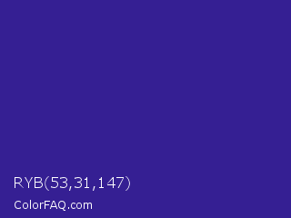 RYB 53,31,147 Color is a normal indigo color and the nearest color is Cosmic Cobalt #2e2d88. Hex code #351f93 and RGB value is rgb(53,31,147). In RGB color space, this color is composed of 21% red, 12% green, 58% blue, In CMYK color space, this color is composed of 64% cyan, 79% magenta, 0% yellow , 42% black , In HSL color space, this color has a hue angle of 251° , 65% saturation and 35% lightness.
