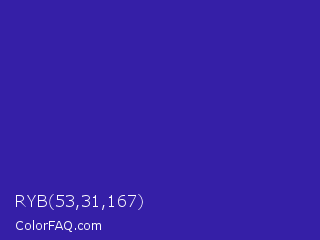 RYB 53,31,167 Color is a normal indigo color and the nearest color is Blue Pigment #333399. Hex code #351fa7 and RGB value is rgb(53,31,167). In RGB color space, this color is composed of 21% red, 12% green, 65% blue, In CMYK color space, this color is composed of 68% cyan, 81% magenta, 0% yellow , 35% black , In HSL color space, this color has a hue angle of 250° , 69% saturation and 39% lightness.