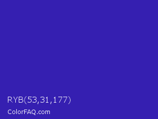 RYB 53,31,177 Color is a normal indigo color and the nearest color is Governor Bay #2f3cb3. Hex code #351fb1 and RGB value is rgb(53,31,177). In RGB color space, this color is composed of 21% red, 12% green, 69% blue, In CMYK color space, this color is composed of 70% cyan, 82% magenta, 0% yellow , 31% black , In HSL color space, this color has a hue angle of 249° , 70% saturation and 41% lightness.