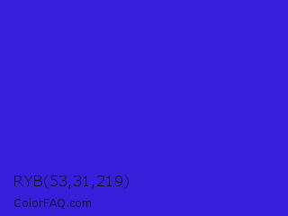 RYB 53,31,219 Color is a normal indigo color and the nearest color is Interdimensional Blue #360ccc. Hex code #351fdb and RGB value is rgb(53,31,219). In RGB color space, this color is composed of 21% red, 12% green, 86% blue, In CMYK color space, this color is composed of 76% cyan, 86% magenta, 0% yellow , 14% black , In HSL color space, this color has a hue angle of 247° , 75% saturation and 49% lightness.