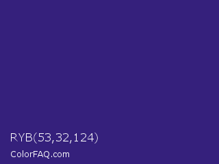 RYB 53,32,124 Color is a normal indigo color and the nearest color is Meteorite #3c1f76. Hex code #35207c and RGB value is rgb(53,32,124). In RGB color space, this color is composed of 21% red, 13% green, 49% blue, In CMYK color space, this color is composed of 57% cyan, 74% magenta, 0% yellow , 51% black , In HSL color space, this color has a hue angle of 254° , 59% saturation and 31% lightness.