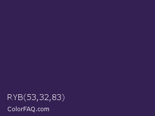 RYB 53,32,83 Color is a dark violet color and the nearest color is Deep Grape #381a51. Hex code #352053 and RGB value is rgb(53,32,83). In RGB color space, this color is composed of 21% red, 13% green, 33% blue, In CMYK color space, this color is composed of 36% cyan, 61% magenta, 0% yellow , 67% black , In HSL color space, this color has a hue angle of 265° , 44% saturation and 23% lightness.