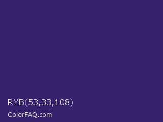 RYB 53,33,108 Color is a dark indigo color and the nearest color is Jacarta #3a2a6a. Hex code #35216c and RGB value is rgb(53,33,108). In RGB color space, this color is composed of 21% red, 13% green, 42% blue, In CMYK color space, this color is composed of 51% cyan, 69% magenta, 0% yellow , 58% black , In HSL color space, this color has a hue angle of 256° , 53% saturation and 28% lightness.