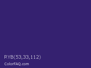 RYB 53,33,112 Color is a dark indigo color and the nearest color is Meteorite #3c1f76. Hex code #352170 and RGB value is rgb(53,33,112). In RGB color space, this color is composed of 21% red, 13% green, 44% blue, In CMYK color space, this color is composed of 53% cyan, 71% magenta, 0% yellow , 56% black , In HSL color space, this color has a hue angle of 255° , 54% saturation and 28% lightness.