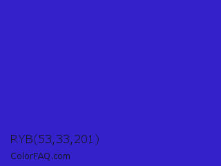 RYB 53,33,201 Color is a normal indigo color and the nearest color is Interdimensional Blue #360ccc. Hex code #3521c9 and RGB value is rgb(53,33,201). In RGB color space, this color is composed of 21% red, 13% green, 79% blue, In CMYK color space, this color is composed of 74% cyan, 84% magenta, 0% yellow , 21% black , In HSL color space, this color has a hue angle of 247° , 72% saturation and 46% lightness.