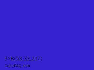 RYB 53,33,207 Color is a normal indigo color and the nearest color is Interdimensional Blue #360ccc. Hex code #3521cf and RGB value is rgb(53,33,207). In RGB color space, this color is composed of 21% red, 13% green, 81% blue, In CMYK color space, this color is composed of 74% cyan, 84% magenta, 0% yellow , 19% black , In HSL color space, this color has a hue angle of 247° , 73% saturation and 47% lightness.