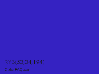 RYB 53,34,194 Color is a normal indigo color and the nearest color is Interdimensional Blue #360ccc. Hex code #3522c2 and RGB value is rgb(53,34,194). In RGB color space, this color is composed of 21% red, 13% green, 76% blue, In CMYK color space, this color is composed of 73% cyan, 82% magenta, 0% yellow , 24% black , In HSL color space, this color has a hue angle of 247° , 70% saturation and 45% lightness.