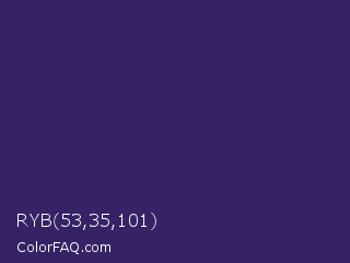 RYB 53,35,101 Color is a dark indigo color and the nearest color is Jacarta #3a2a6a. Hex code #352365 and RGB value is rgb(53,35,101). In RGB color space, this color is composed of 21% red, 14% green, 40% blue, In CMYK color space, this color is composed of 48% cyan, 65% magenta, 0% yellow , 60% black , In HSL color space, this color has a hue angle of 256° , 49% saturation and 27% lightness.