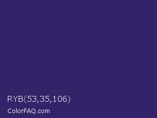RYB 53,35,106 Color is a dark indigo color and the nearest color is Jacarta #3a2a6a. Hex code #35236a and RGB value is rgb(53,35,106). In RGB color space, this color is composed of 21% red, 14% green, 42% blue, In CMYK color space, this color is composed of 50% cyan, 67% magenta, 0% yellow , 58% black , In HSL color space, this color has a hue angle of 255° , 50% saturation and 28% lightness.