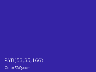 RYB 53,35,166 Color is a normal indigo color and the nearest color is Blue Pigment #333399. Hex code #3523a6 and RGB value is rgb(53,35,166). In RGB color space, this color is composed of 21% red, 14% green, 65% blue, In CMYK color space, this color is composed of 68% cyan, 79% magenta, 0% yellow , 35% black , In HSL color space, this color has a hue angle of 248° , 65% saturation and 39% lightness.