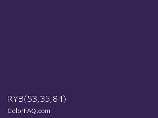 RYB 53,35,84 Color is a dark violet color and the nearest color is Deep Grape #381a51. Hex code #352354 and RGB value is rgb(53,35,84). In RGB color space, this color is composed of 21% red, 14% green, 33% blue, In CMYK color space, this color is composed of 37% cyan, 58% magenta, 0% yellow , 67% black , In HSL color space, this color has a hue angle of 262° , 41% saturation and 23% lightness.