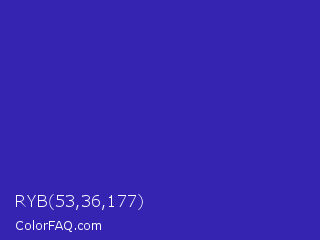 RYB 53,36,177 Color is a normal indigo color and the nearest color is Governor Bay #2f3cb3. Hex code #3524b1 and RGB value is rgb(53,36,177). In RGB color space, this color is composed of 21% red, 14% green, 69% blue, In CMYK color space, this color is composed of 70% cyan, 80% magenta, 0% yellow , 31% black , In HSL color space, this color has a hue angle of 247° , 66% saturation and 42% lightness.