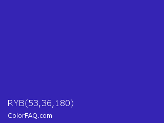 RYB 53,36,180 Color is a normal indigo color and the nearest color is Governor Bay #2f3cb3. Hex code #3524b4 and RGB value is rgb(53,36,180). In RGB color space, this color is composed of 21% red, 14% green, 71% blue, In CMYK color space, this color is composed of 71% cyan, 80% magenta, 0% yellow , 29% black , In HSL color space, this color has a hue angle of 247° , 67% saturation and 42% lightness.
