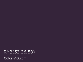 RYB 53,36,58 Color is a very dark purple color and the nearest color is Blackcurrant #32293a. Hex code #35243a and RGB value is rgb(53,36,58). In RGB color space, this color is composed of 21% red, 14% green, 23% blue, In CMYK color space, this color is composed of 9% cyan, 38% magenta, 0% yellow , 77% black , In HSL color space, this color has a hue angle of 286° , 23% saturation and 18% lightness.